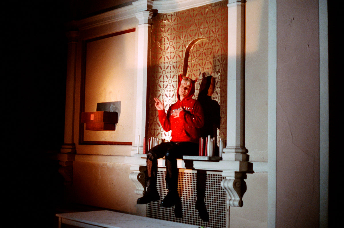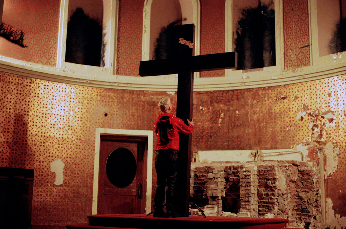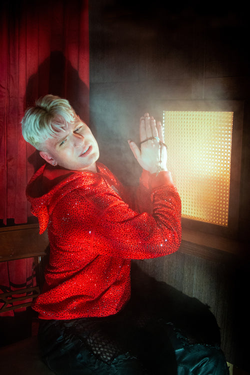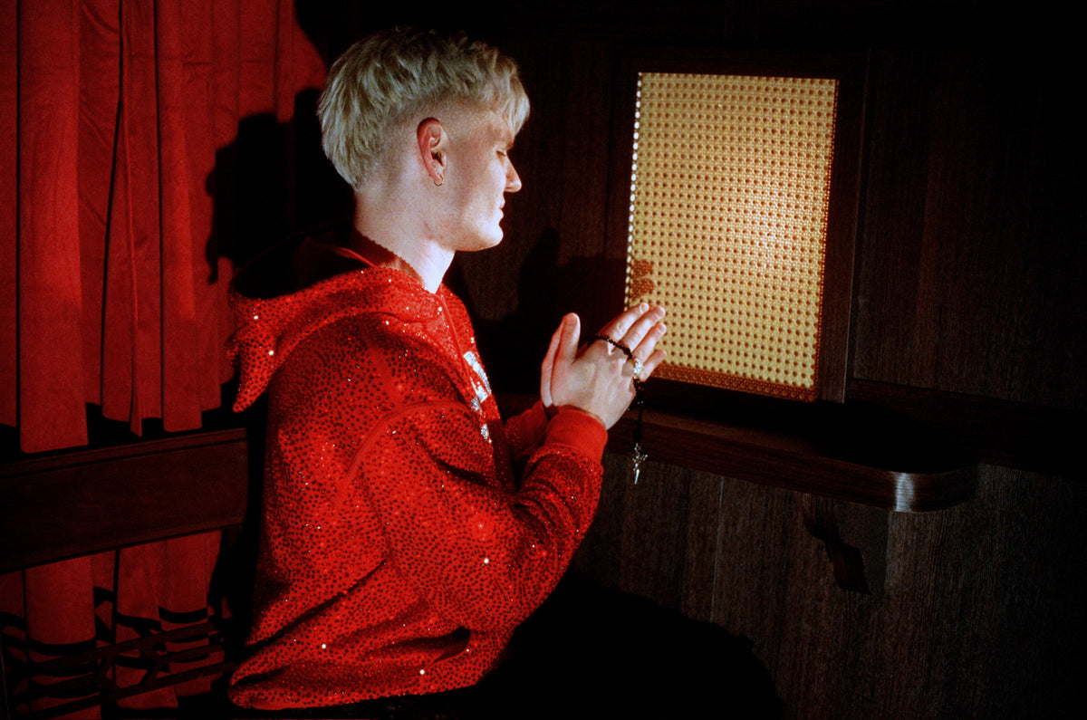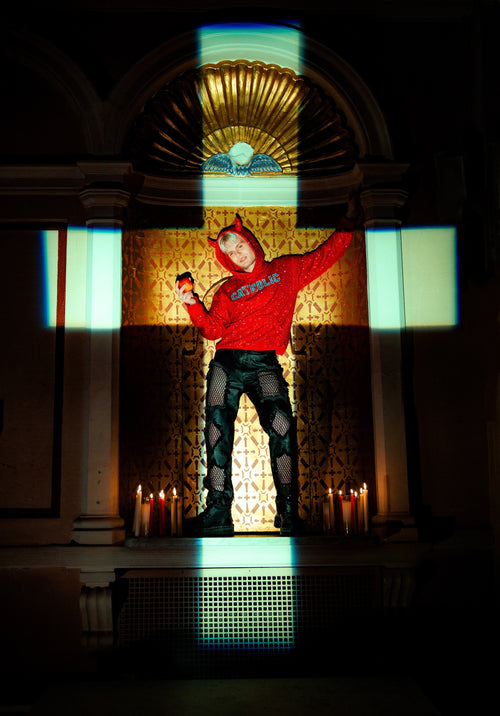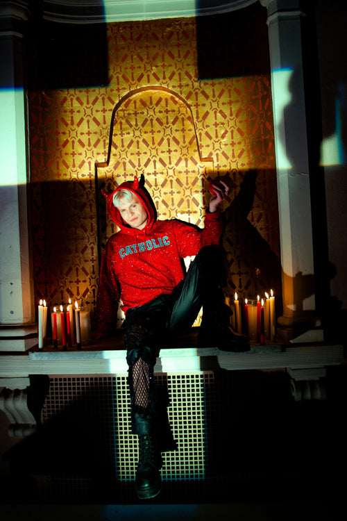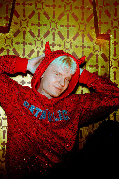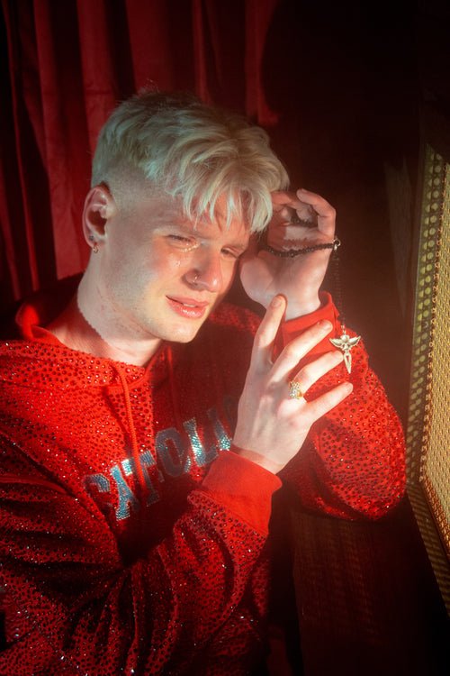 It’s not every day that you see someone walking down the street in a fire engine red hoodie that says “CATHOLIC” across the front. Unless of course you’re a resident of Charlotte, North Carolina, the home of Charlotte Catholic High School and its uniquely literal school uniform. As a gay CCHS alumni with an affinity for camp concepts and a taste for the ridiculous, I always found it funny that these sweatshirts were so normalized, a part of Charlotte’s culture. It would be even funnier to take this symbol of my Catholic upbringing and push the absurdity to the next level. I’d say the idea to rhinestone a Charlotte Catholic hoodie came to me like the Virgin Mary’s conception of Christ, but in order to bear the concept, I had to be fucked long and hard by the Catholic School System. As I sat in a meditative state embellishing the hoodie with over 25,000 individually placed rhinestones, traumatic memories began to flood my mind. It became clear that this project was more than artistic satire, it was a catalyst that sparked a deep introspection into my experience as a queer person growing up in the Catholic School System, its psychological after effects, and my long perilous journey to self-acceptance and self-actualization.