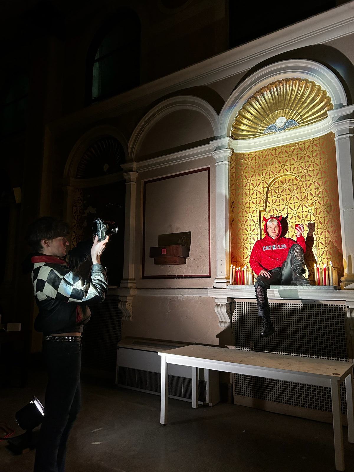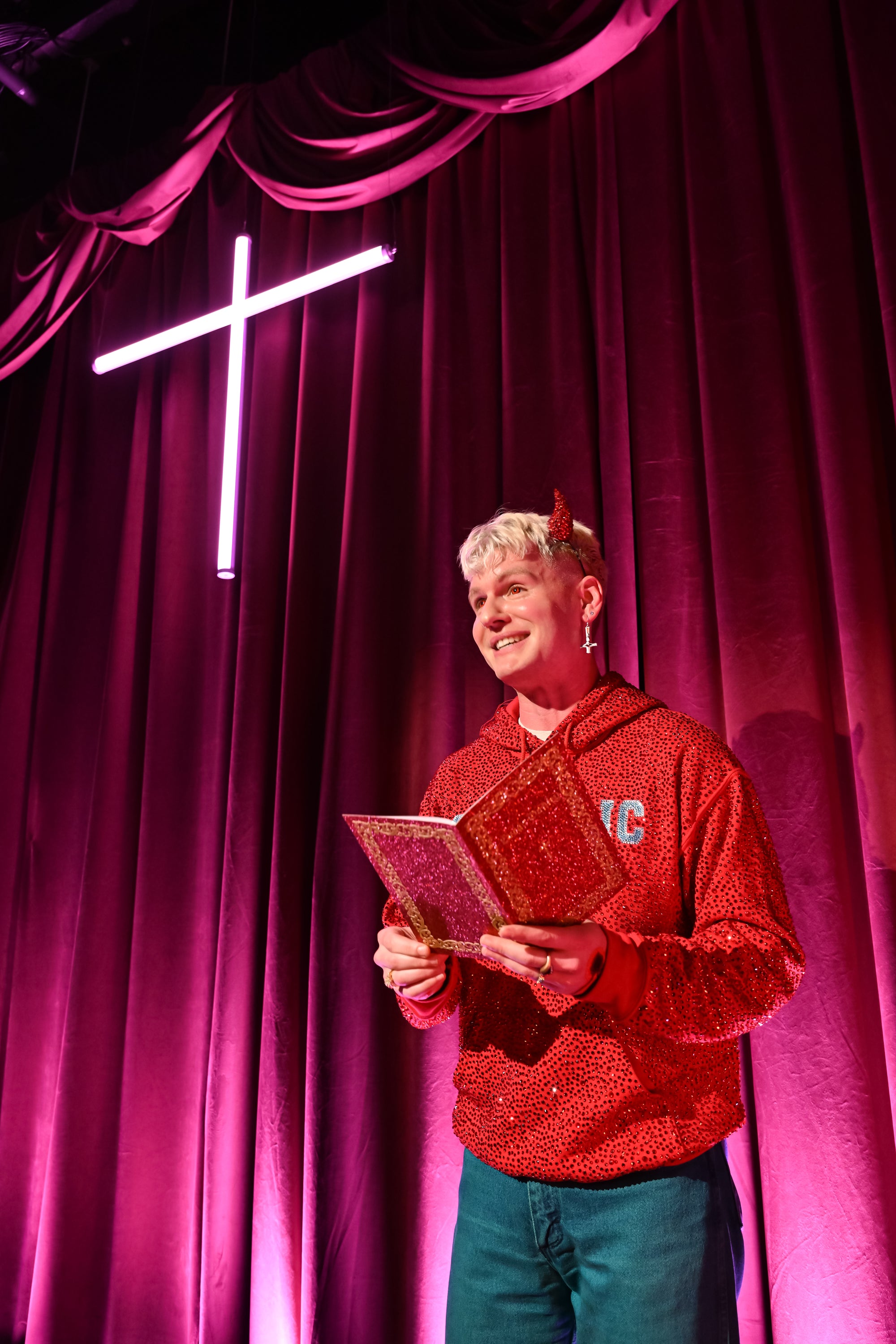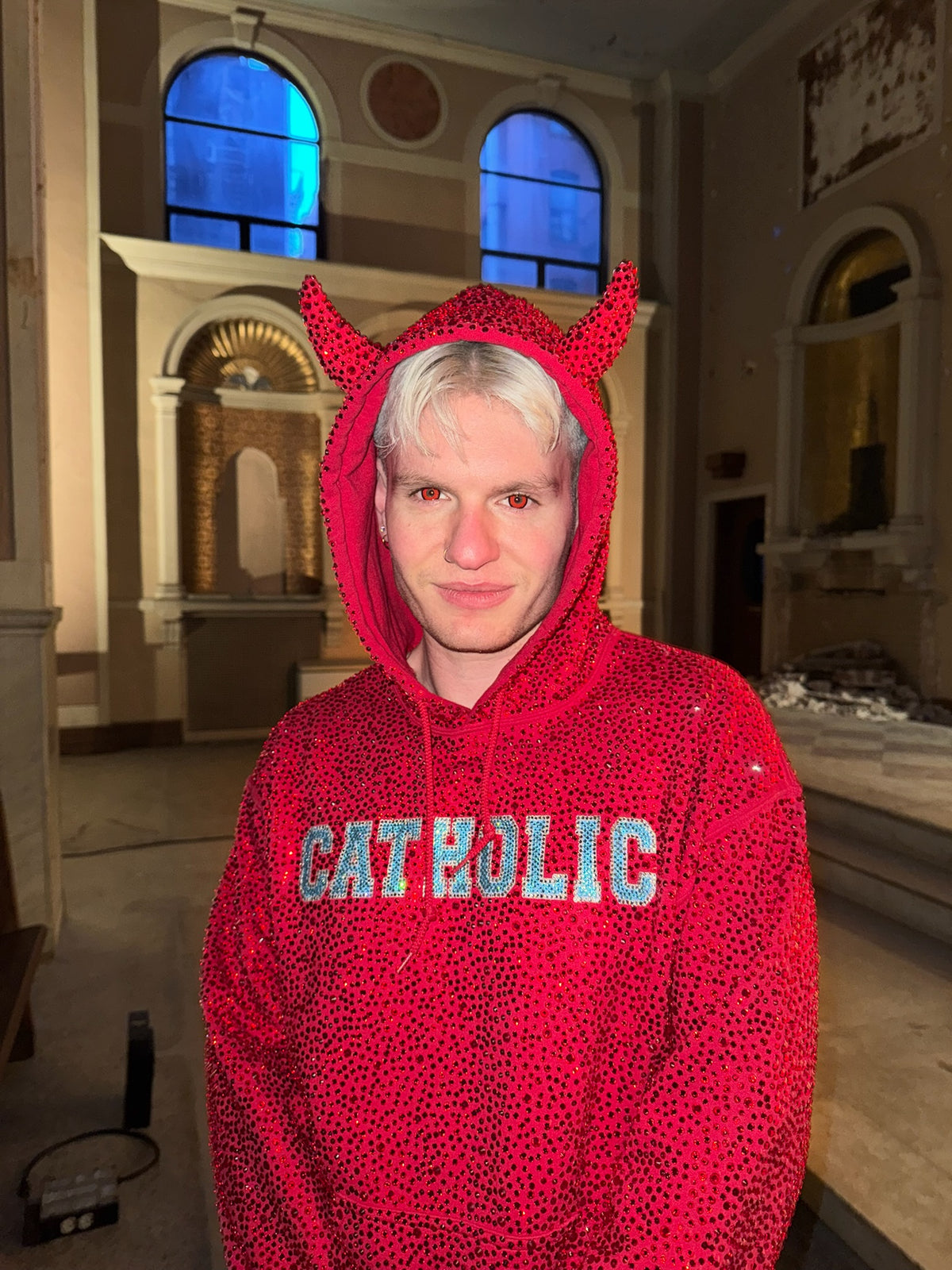 As I placed the final rhinestones on my Charlotte Catholic hoodie, I felt overcome with wisdom. That scared, insecure version of myself had to die on the cross. But you know I didn’t die, just like my fully stoned hoodie I had crystallized, and now I’m a glamazon bitch ready for the runway! I’ve risen as someone free to live, love and express myself authentically. I no longer seek approval from others because I’ve discovered the inner strength to approve of myself wholeheartedly. Everything I was running from has transformed into my superpower. I am gay. I am an artist. And guess what? I am free! If I’m too much for you, change the fucking channel—me and my devil horns ain’t going nowhere!